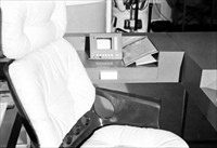 A view from the Command Desk to the Earth globe and windows. The long white boxes on the desk are a Pio Manzu Kartell ash tray (orange versions appear in Command Center in Year 2); they contain plastic cards which appear to be memory cards.