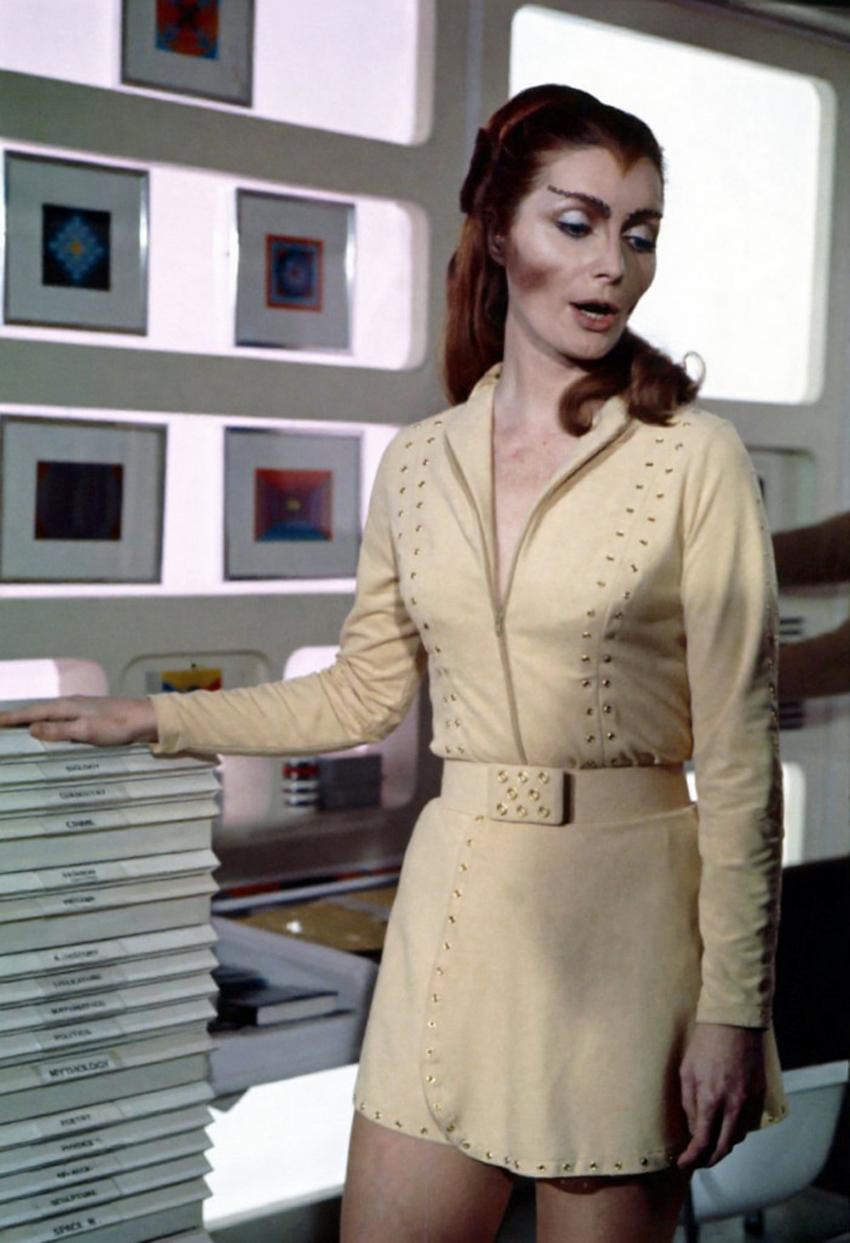 The end wall in Helena's quarters, from The Exiles. We don't see where her bed is in this episode. This shot also reveals the rarely seen facing wall, although in the same episode there is one fake reverse shot (Helena and Maya are shot talking to each other with the same curved corner and cupboards behind them). When Maya transforms, we briefly see a Medical Center computer panel behind her, which is not on this set.
