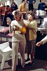 Helene Bevan prepares the wig for Suzanne Heimer on the Main Mission set for Breakaway
