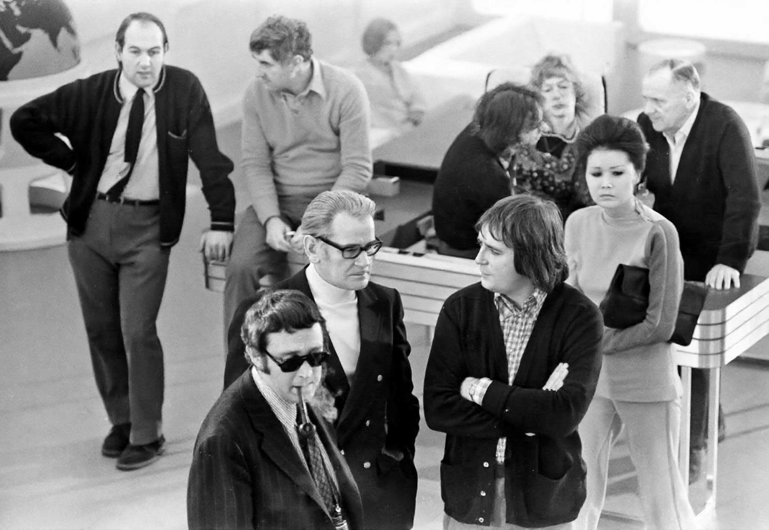 Gerry Anderson (series producer), Lew Grade (managing director, ATV), Bernard J Kingham (ITC executive in charge of production) and Bruce Gyngell (deputy managing director, ATV) during a visit to Pinewood Studios while filming Earthbound