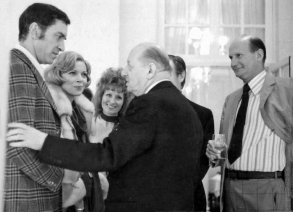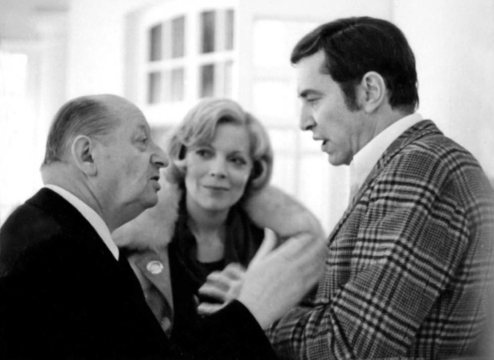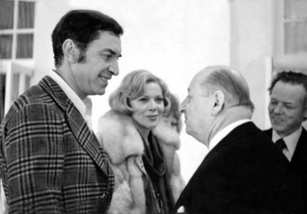 Lew Grade welcomes Martin Landau and Barbara Bain to Britain, in a reception at Pinewood studios in November 1973.