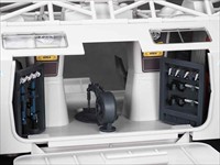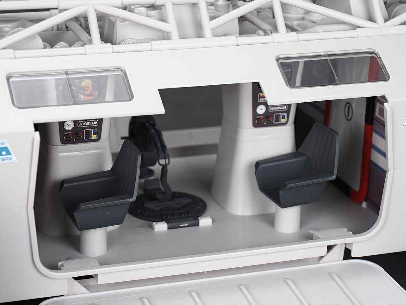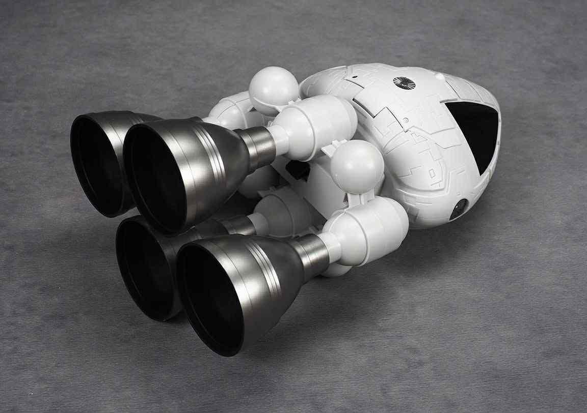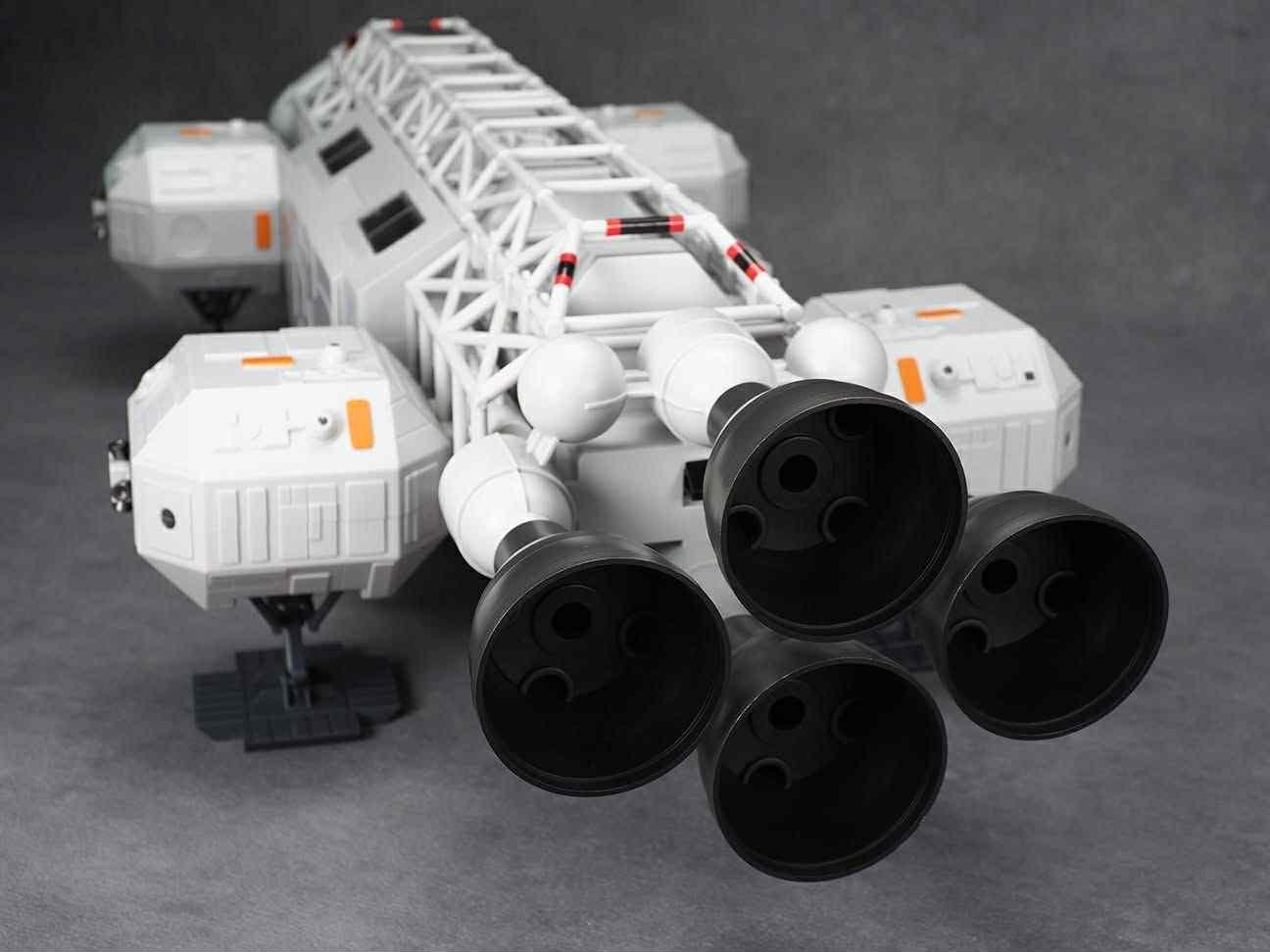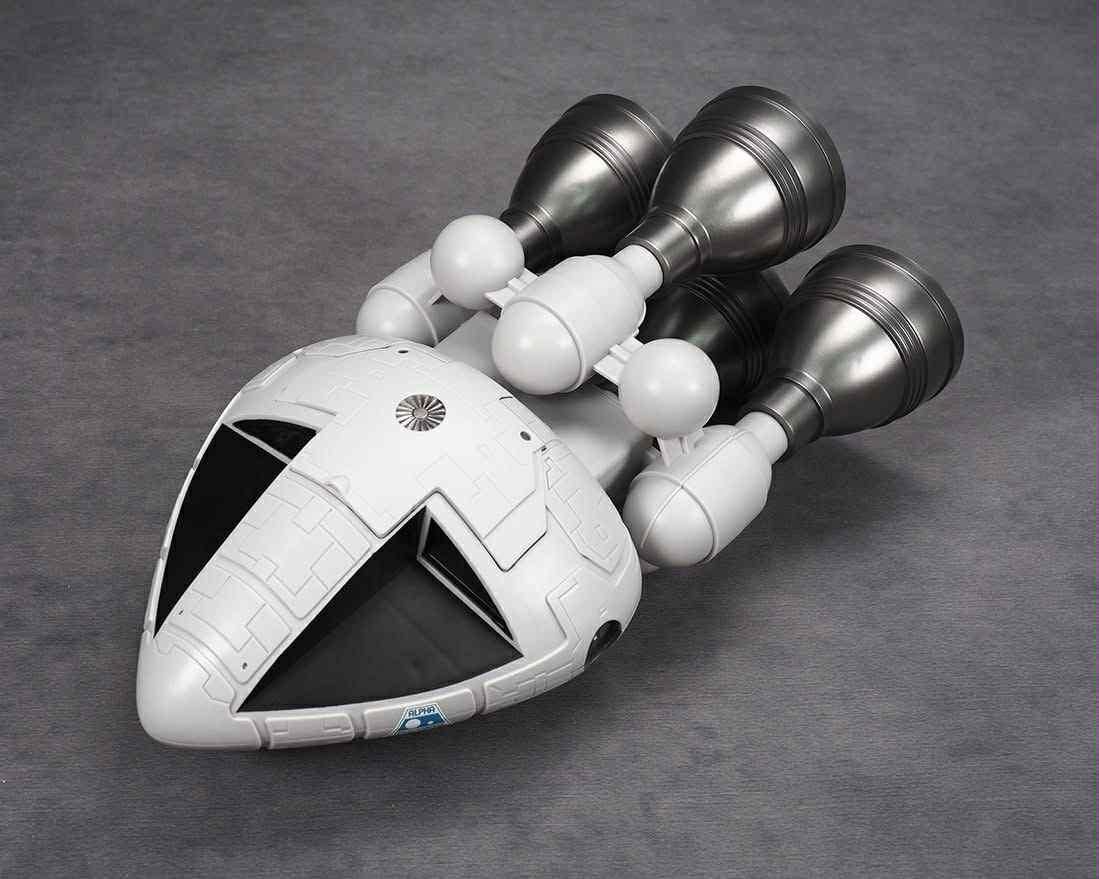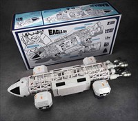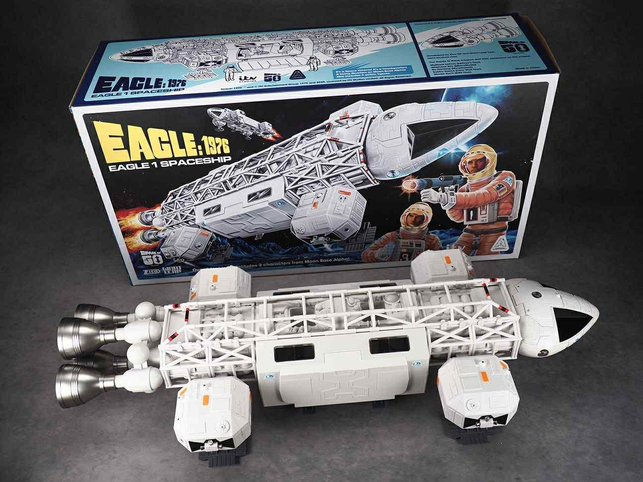 This model was based on the Mattel 1976 Eagle, updated with more accurate detail (especially the legs) but retaining the play features of the original (such as the pod interior with winch). It is a little longer than the Mattel Eagle, at 91cm long (10cm longer than the original). There are two 9cm tall astronaut figures with 4 commlocks, 4 stun guns, 2 laser rifles and 2 APL rifles; individual action figures are the obvious next follow-up.