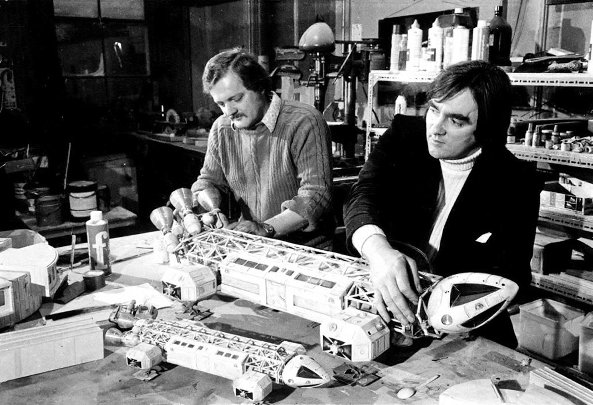 A set of publicity photos of Brian Johnson, Nick Allder and art director Cyril Forster in the model room at Bray Studios.