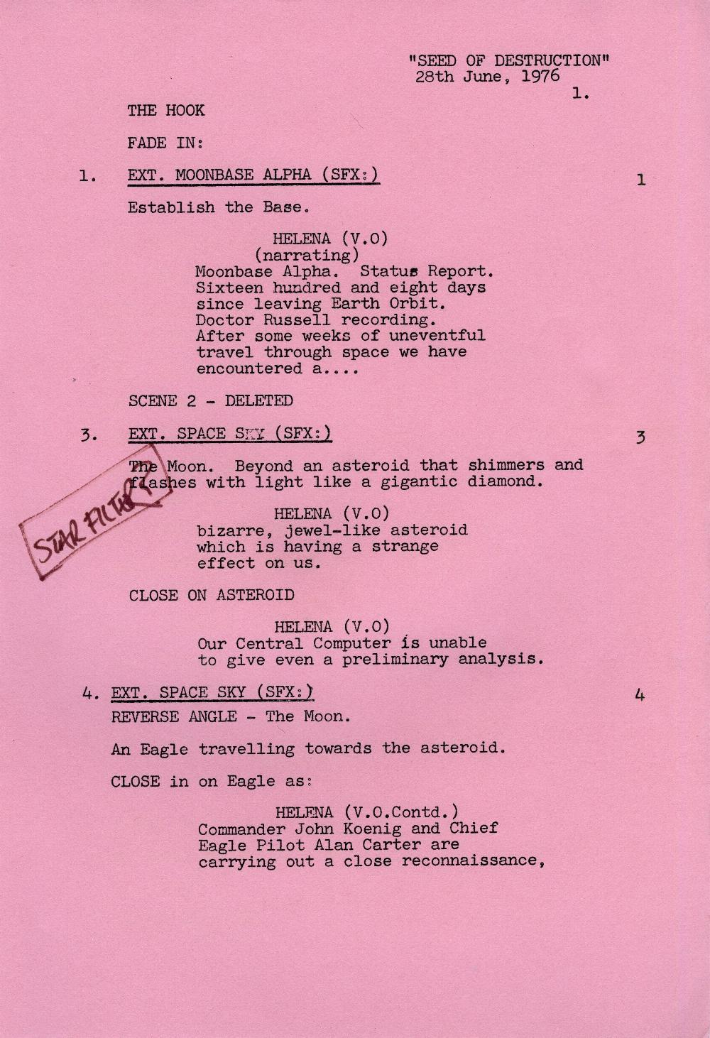 The final shooting script of Seed Of Destruction by John Goldsmith was dated Tuesday 25th May 1976. A month later, the pink page amendments appeared on Monday 28th June, followed by a shooting schedule dated Thursday 1 July, for filming beginning Monday 5th July. The two episodes being filmed (Catacombs of the Moon and The AB Chrysalis) were over-running, so, on the projected start date of Monday 5th, a second shooting schedule was published, pushing the start date back two days to Wednesday 7th July.