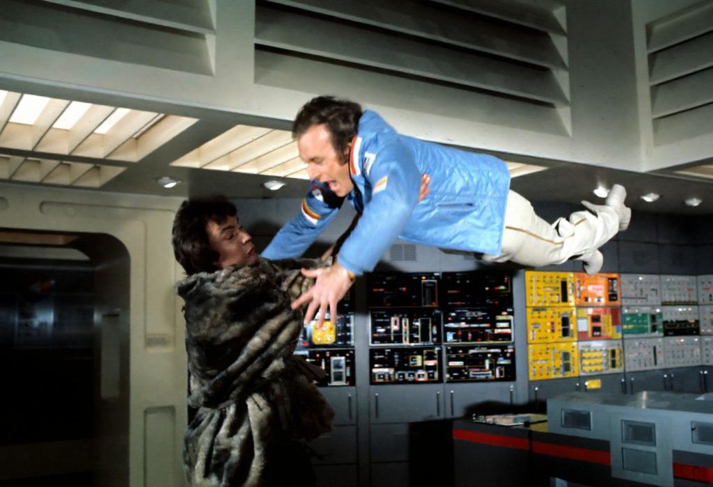 Maya vs Vegan. Presumably Catherine Schell is suspended in the air with an invisible cable.