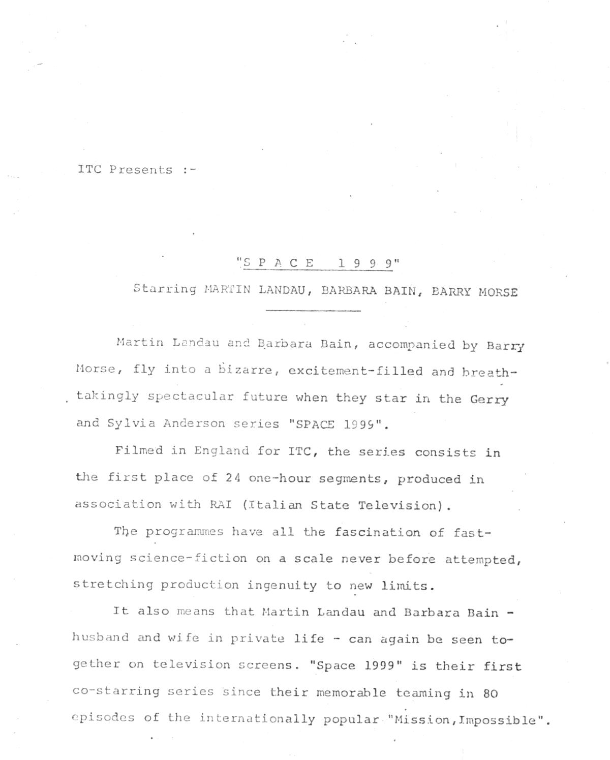 Martin Landau and Barbara Bain, accompanied by Barry Morse, fly into a bizarre, excitement-filled and breath- takingly spectacular future when they star in the Gerry and Sylvia Anderson series "SPACE 1999".