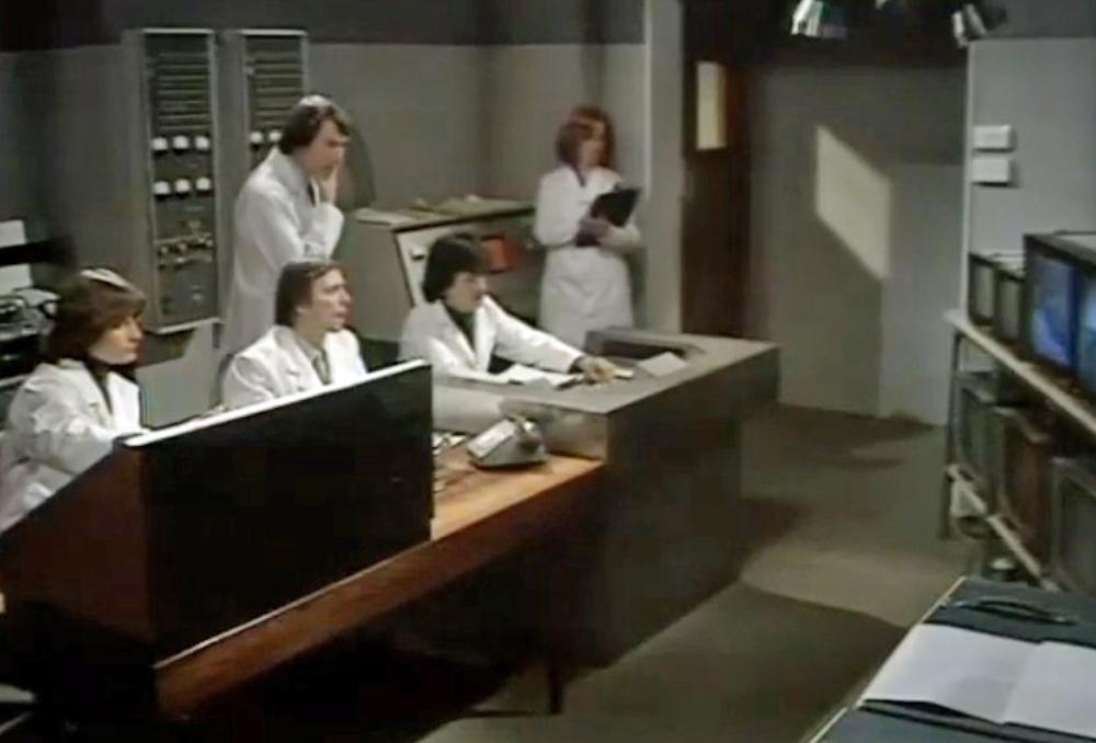 In December 1977, the BBC sitcom Come Back Mrs Noah has two modified Main Mission desks. In the last episode from 1978, Kano's desk appears alongside one of the desks. One of the desks is probably Paul's, because the hatch is open; a small projecting screen has been added. The other is probably Sandra's desk, but the instrumentation is completely different, with a central speaker panel and a number of toggle switches.