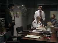 In 1977, Keith Wilson used 3 desks, again with solid bases, in the RAF control room in The New Avengers episode "Obsession". Kano's desk is on the end, closest to us, with Paul Morrow's desk in the centre. The third isn't clearly seen, but is presumably Sandra's desk. Note all are still pretty much as they appeared in year 2.