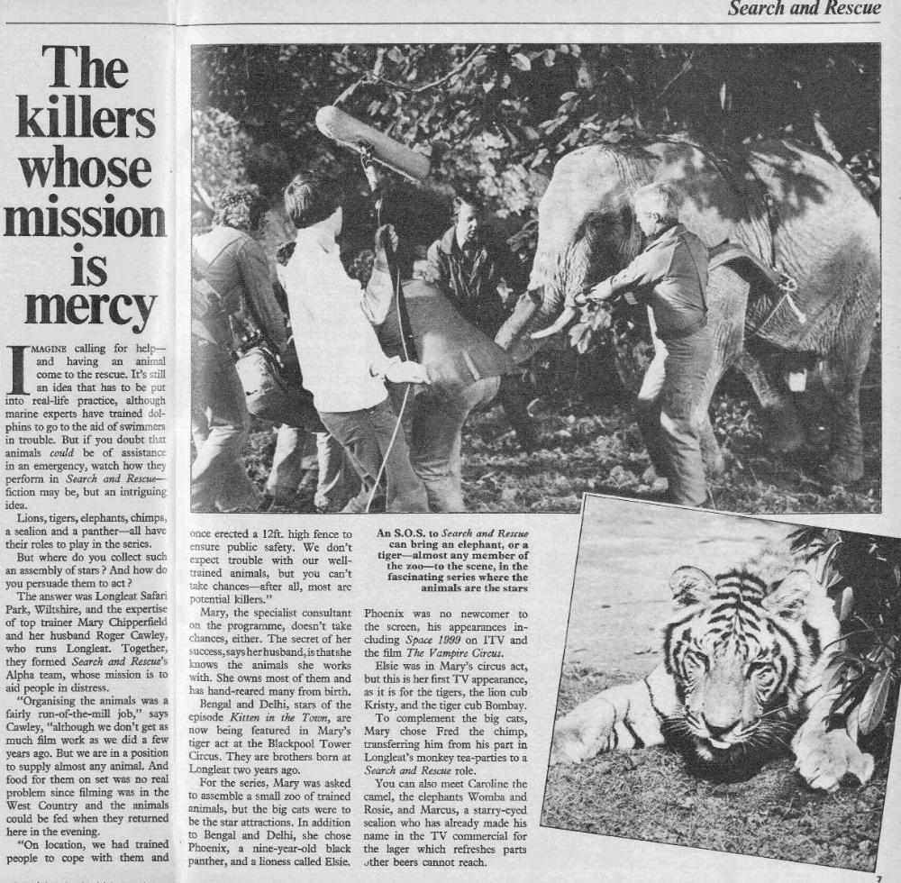 The answer was Longleat Safari Park, Wiltshire, and the expertise of top trainer Mary Chipperfield and her husband Roger Cawley, who runs Longleat. Together, they formed Search and Rescue's Alpha team, whose mission is to aid people in distress.