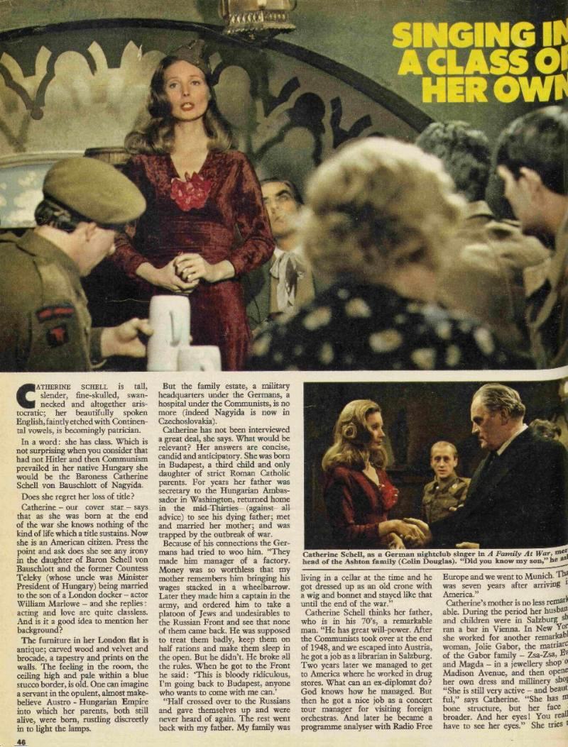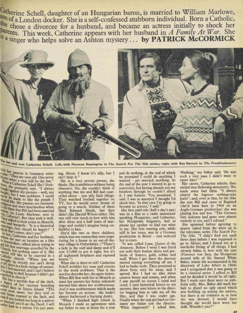 Catherine Schell, daughter of an Hungarian baron, is married to William Marlowe, Son of a London docker. She is a self-confessed stubborn individual. Born a Catholic, she chose a divorcee for a husband, and became an actress initially to shock her parents. This week, Catherine appears with her husband in A Family At War. She is a singer who helps solve an Ashton mystery... by PATRICK MCCORMICK