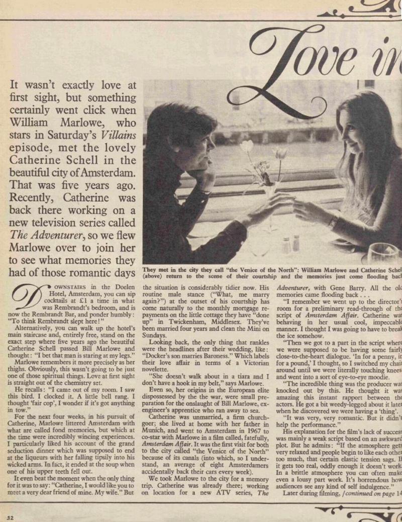 It wasn't exactly love at first sight, but something certainly went click when William Marlowe, who stars in Saturday's Villains episode, met the lovely Catherine Schell in the beautiful city of Amsterdam. That was five years ago. Recently, Catherine was back there working on a new television series called The Adventurer, so we flew Marlowe over to join her to see what memories they had of those romantic days