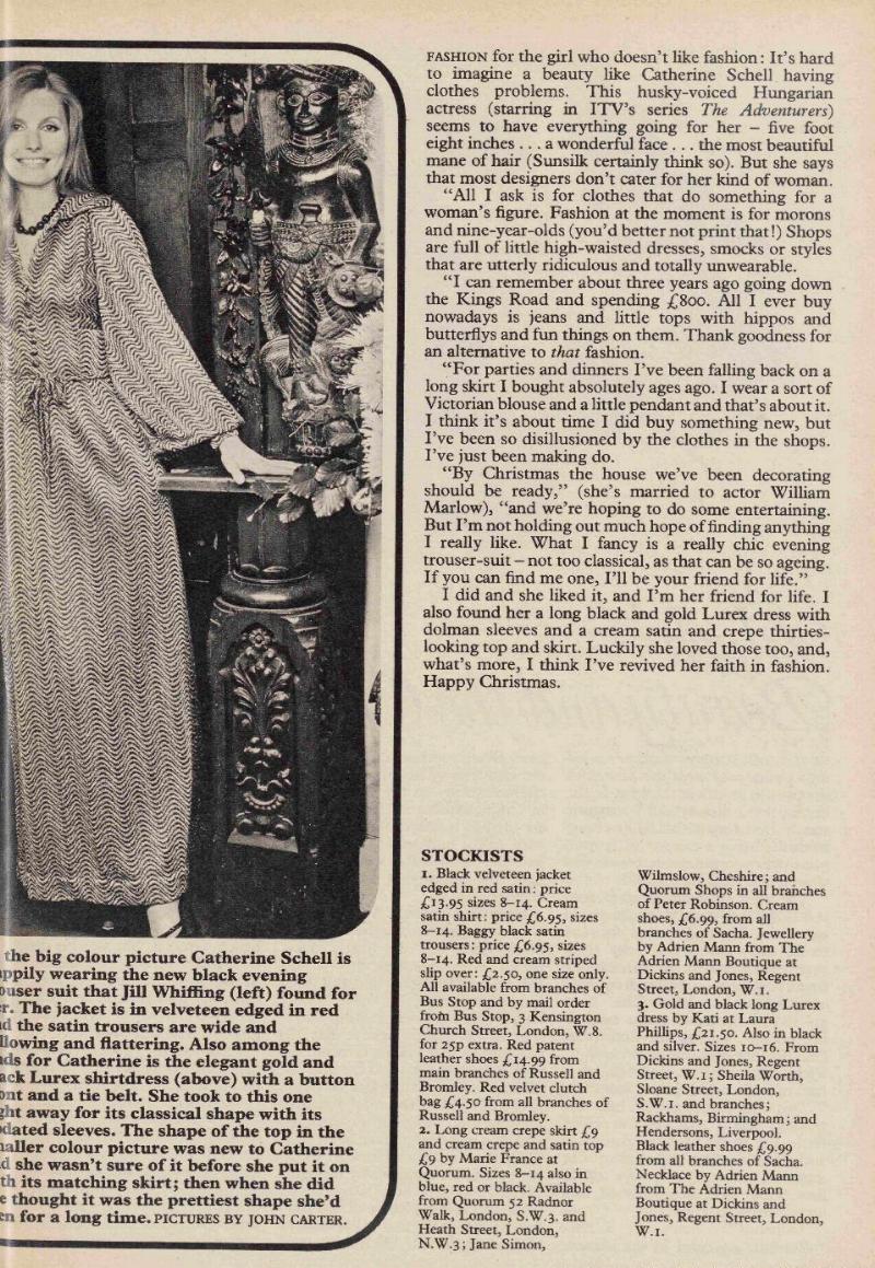 Fashion for the girl who doesn't like fashion: It's hard to imagine a beauty like Catherine Schell having clothes problems. This husky-voiced Hungarian actress (starring in ITV's series The Adventurers) seems to have everything going for her - five foot eight inches... a wonderful face... the most beautiful mane of hair (Sunsilk certainly think so). But she says that most designers don't cater for her kind of woman. "All I ask is for clothes that do something for a woman's figure. Fashion at the moment is for morons and nine-year-olds (you'd better not print that!) Shops are full of little high-waisted dresses, smocks or styles that are utterly ridiculous and totally unwearable.