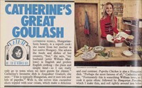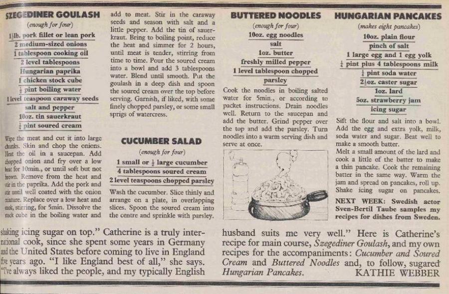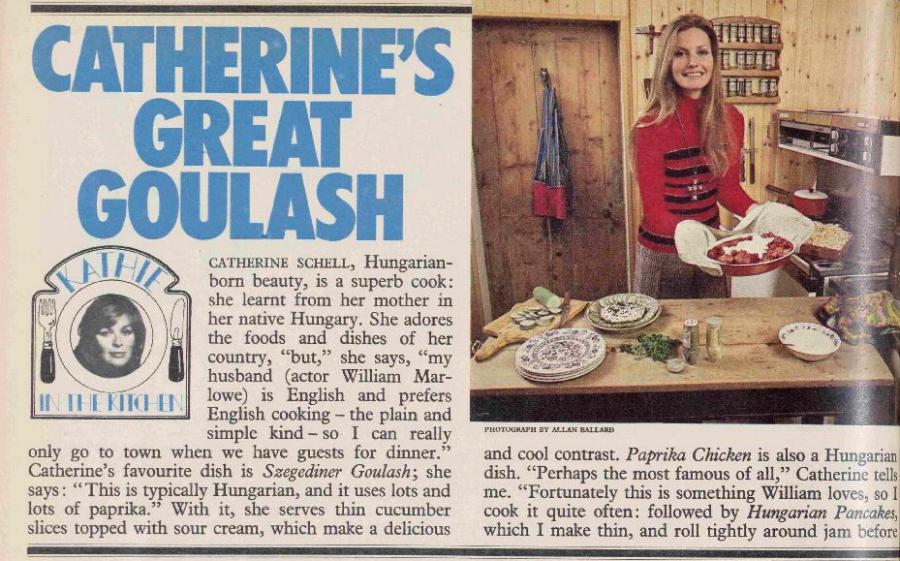 CATHERINE SCHELL, Hungarian- born beauty, is a superb cook: she learnt from her mother in her native Hungary. She adores the foods and dishes of her country, "but," she says, "my husband (actor William Marlowe) is English and prefers English cooking - the plain and simple kind so I can really only go to town when we have guests for dinner." Catherine's favourite dish is Szegediner Goulash; she says: "This is typically Hungarian, and it uses lots and lots of paprika." With it, she serves thin cucumber slices topped with sour cream, which make a delicious and cool contrast. Paprika Chicken is also a Hungarian dish. "Perhaps the most famous of all," Catherine tells me. "Fortunately this is something William loves, so I cook it quite often: followed by Hungarian Pancakes, which I make thin, and roll tightly around jam before shaking icing sugar on top." Catherine is a truly inter- national cook, since she spent some years in Germany and the United States before coming to live in England five years ago. "I like England best of all," she says. "I've always liked the people, and my typically English husband suits me very well." Here is Catherine's recipe for main course, Szegediner Goulash, and my own recipes for the accompaniments: Cucumber and Soured Cream and Buttered Noodles and, to follow, sugared Hungarian Pancakes.