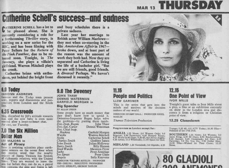 CATHERINE SCHELL has a lot to be pleased about. She is currently considering a role for a forthcoming Thriller story, is working on a new series for the BBC, and has been filming with Peter Sellers for the Return of the Pink Panther, due to be re- leased soon. Tonight, in The Sweeney, she plays a villain's girlfriend. Warren Mitchell plays the crook. Catherine brims with enthusiasm, yet behind the bright front and busy schedules there is a private sadness.