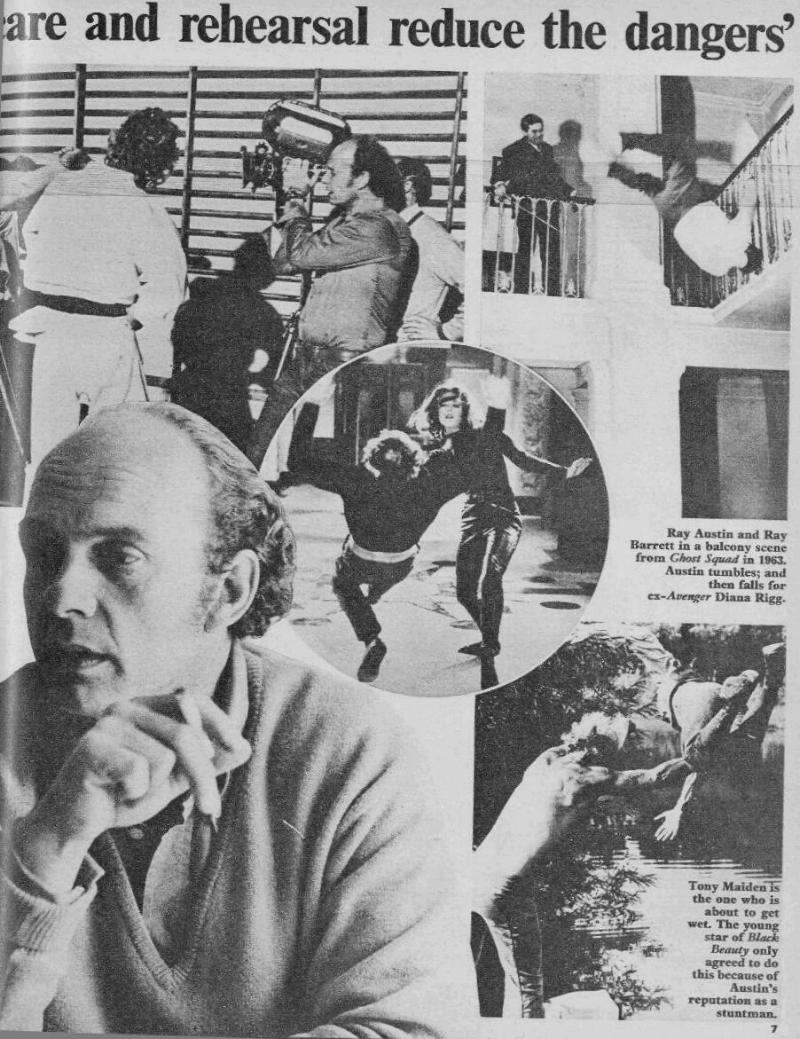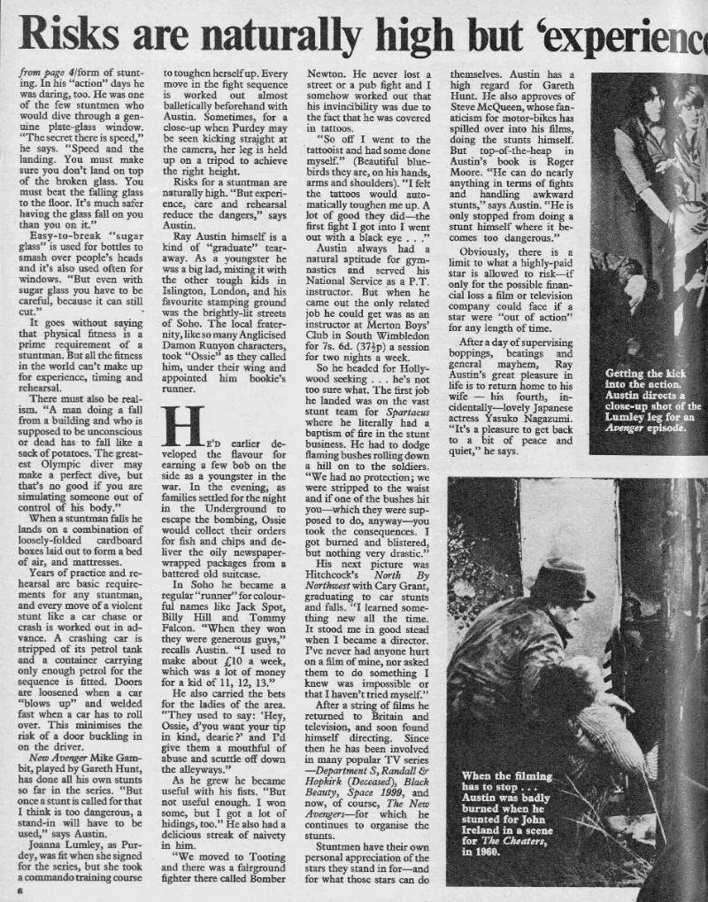 N0t to get hurt- that's the first rule for a stuntman. And one man who knows how to go about surviving in filmdom's most dangerous job is stuntman/director Ray Austin-the man who taught The New Avengers how to fight. In fact, he taught all the Avenger girls - Honor Blackman, Diana Rigg, Linda Thorson and now Joanna Lumley- how to create their own special brands of havoc. Austin, who spends most of his time these days behind the cameras as a director rather than as a baddie falling off a three-storey building, has worked in virtually every form of stunting. In his "action" days he was daring, too. He was one of the few stuntmen who would dive through a genuine plate-glass window. "The secret there is speed," he says. "Speed and the landing. You must make sure you don't land on top of the broken glass. You must beat the falling glass to the floor. It's much safer having the glass fall on you than you on it."