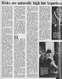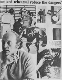 New Avenger Mike Gambit, played by Gareth Hunt, has done all his own stunts so far in the series. "But once a stunt is called for that I think is too dangerous, a stand-in will have to be used," says Austin. Joanna Lumley, as Purdey, was fit when she signed for the series, but she took a commando training course to toughen herself up. Every move in the fight sequence is worked out almost balletically beforehand with Austin. Sometimes, for a close-up when Purdey may be seen kicking straight at the camera, her leg is held up on a tripod to achieve the right height.