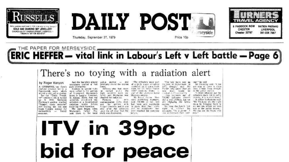 A Liverpool toy firm's realistic creation led to a Doomwatch scare which dared a city police station. For the "Eagle Freighter canisters which turned up in little Marianne Fleckeny's garden marked "Danger, waste material" and bearing the red end black triangle symbol for radioactivity - fooled everyone.