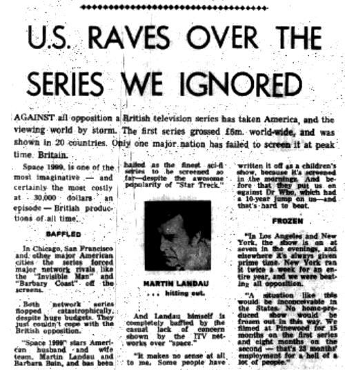 "Space 1999 stars American husband and wife team Martin Landau and Barbara Bain, and has been hailed as the finest sci-fi series to be screened so far- despite the awesome popularity of "Star Treck"
