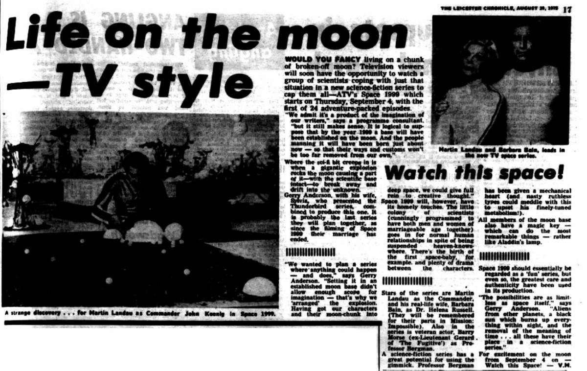 Where the sci-fi bit creeps in is when a gigantic explosion rocks the moon causing a part of it-with the scientific base intact to break away and drift into the unknown. Gerry Anderson, with his wife, Sylvia, who presented the Thunderbird series, combined to produce this one. It is probably the last series they will plan together, as since the filming of Space 1999 their marriage has ended.