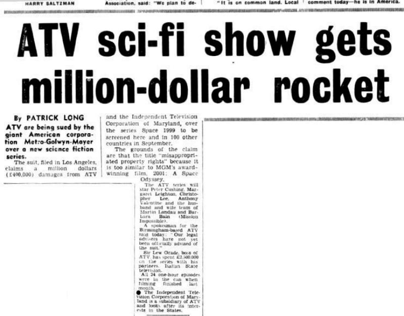 The suit filed in Los Angeles, claims a million dollars (£400,000) damages from ATV and the Independent Television Corporation of Maryland, over the series Space 1999 to be screened here and in 100 other countries in September.
