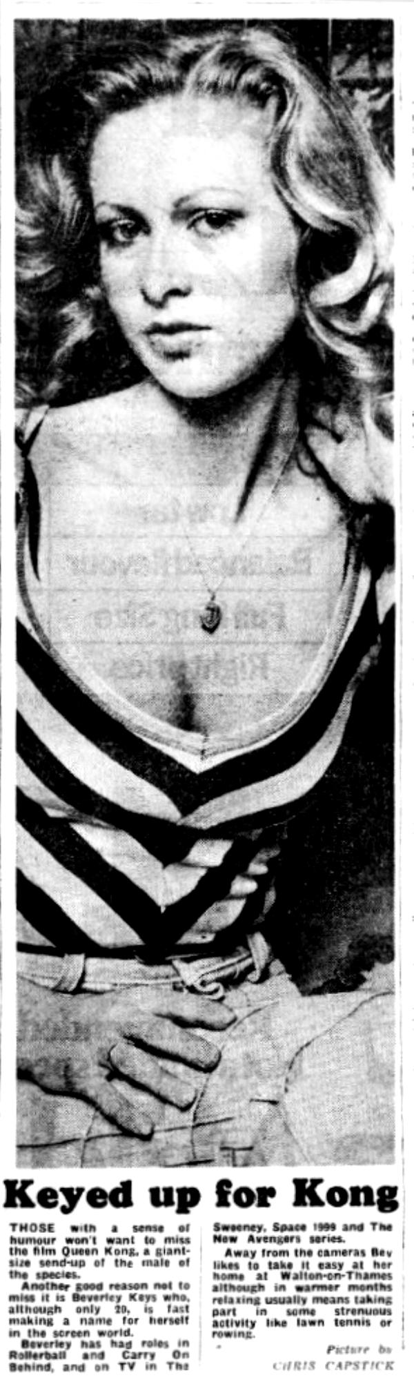Evening News, Wednesday 19 January 1977 p9. Beverley Keys was in two episodes. Queen Kong, starring Rula Lenska and Valerie Leon, was never released because of a lawsuit from Dino De Laurentiis, who was making the King Kong movie released in 1978.