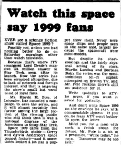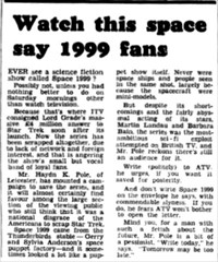 Mr. Haydn K. Pole, of Leicester, has mounted a campaign to save the series, and it will almost certainly find favour among the large section of the viewing public who still think that it was a national disgrace of the Americans to scrap Star Trek. Space 1999 came from the Thunderbirds stable- Gerry and Sylvia Anderson's space puppet factory- and it some- times looked a lot like a puppet show itself. Never were space ships and people seen in the same shot, largely because the spacecraft were mini-models.