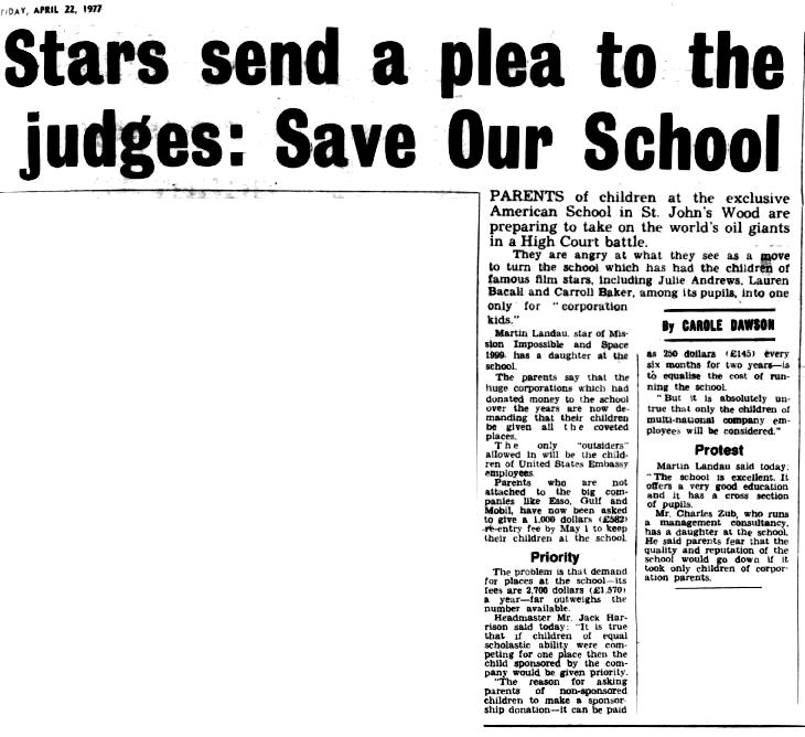 Martin Landau, star of Mission Impossible and Space 1999 has a daughter at the school.